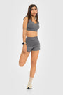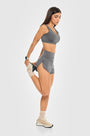 - Short de running en negro o gris — con panty interno invisible y pretina que ajusta el abdomen, ideal para correr sin límites y con total libertad de movimiento.