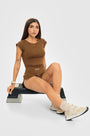 - Crop top camel o marrón oscuro — ajuste medio, cuello bandeja y cobertura total del torso. Perfecto si prefieres entrenar más cubierta.