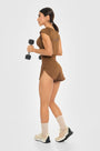 - Short de running camel — con panty interno invisible y pretina que moldea el abdomen, ideal para correr sin límites.